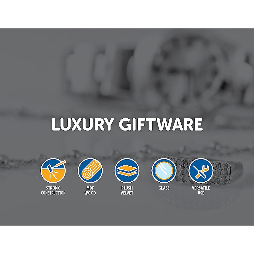 The perfect gift for the jewellery lover, this 10-grid glass-topped wooden watch case from Randy & Travis Machinery displays up to 10 watches in its plush, velvety interior. Store rings, bracelets, and necklaces in this versatile, elegant box. Crafted from wood, this box will be a welcome addition to your dressing table.