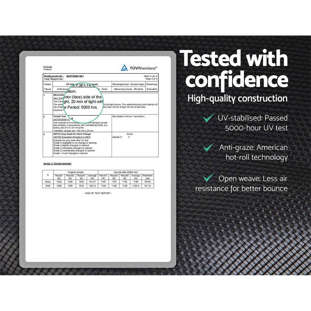 Bounce to your heart's content with our Trampoline. With its superior bounce characteristics featuring 72-piece triple rate springs, the 12-foot trampoline enables safe and durable bouncing with no worries. The heavy-gauge steel framework is designed to handle all robust play and is UV-tested for quality and reliability. Other great features include 8 posts for strong support, 20mm thick padding, anti-graze mat, safety netting and a double-lock zip-and-clip entry. So jump to it and order our trampoline today.
