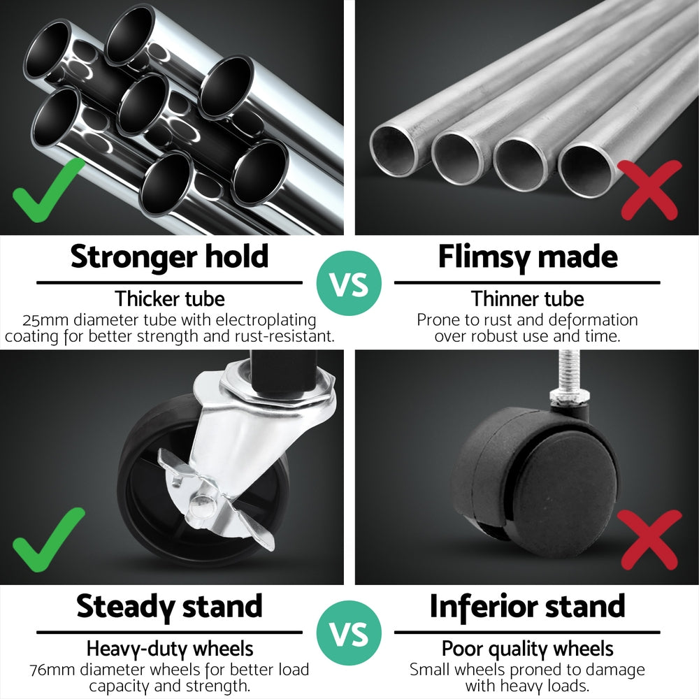 Organise outfits effortlessly with Artiss heavy-duty clothes rack, combining industrial strength with smart design. The corrosion-resistant metal frame ensures long-lasting support for coats, dresses, or other items. Glide smoothly across floors with 360° swivel casters – two lockable wheels keep the rack stationary when needed. Adjust the horizontal rod length to accommodate different clothing sizes, while protective plastic caps shield walls from scratches. Collapse the rack vertically for under-bed or cupboard storage. Perfect for rental spaces, retail displays, or daily home use!