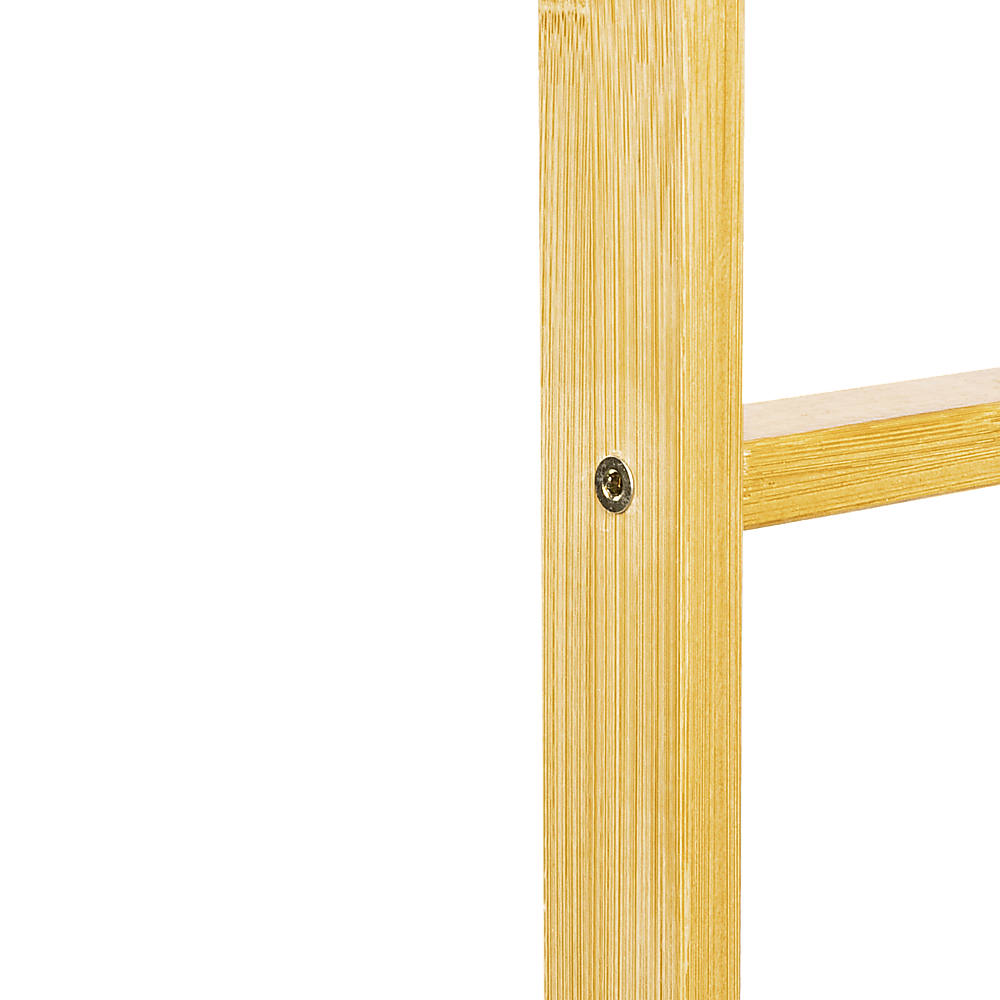 Pretty enough to display in your living room, this natural bamboo rack by Randy & Travis Machinery features two shelves to hold boots, books, or collectibles, four bars to hang blankets or towels to wipe off muddy boots, and six hooks to hang your hats, umbrellas, and handbags, and a central rod to hang coats, shirts, or sweaters with traditional hangers.