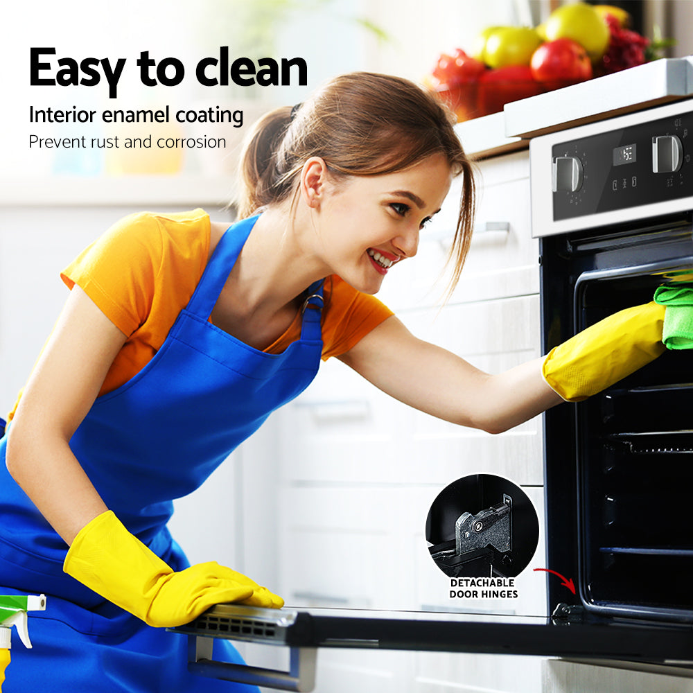 Elevate your culinary creations with this feature-packed built-in oven. The spacious 80L capacity, crafted from food-grade stainless steel, offers ample room for roasting large turkeys or baking multiple dishes simultaneously. Achieve perfectly cooked meals with 360° air circulation that evenly distributes heat for consistent results. This oven boasts user-friendly controls with both simple knobs and a sleek touch panel. Choose from 8 convenient auto cooking functions or customise your settings with the wide temperature range (50-250°C) and 120-minute timer. Cleaning is a breeze thanks to the easy-to-clean enamel cavity, removable side racks, and double-glazed, removable inner door plate. Additionally, safety features like automatic shut-off, a cool-touch handle, and a heat shield vent ensure a stress-free cooking experience. With a built-in light for clear visibility, a tempered glass viewing door, and easy operation, this oven is a perfect addition to any modern kitchen.