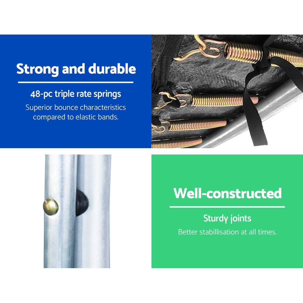 Bounce to your heart's content with the Trampoline. With its superior bounce characteristics featuring 48-piece triple rate springs, the 8-foot Trampoline enables safe and durable bouncing with no worries. The heavy-gauge steel framework is designed to handle all robust play and is UV-tested for quality and reliability. Other great features include a curve design for more rigidness, 20mm thick padding, anti-graze mat, safety netting and a double-lock zip-and-clip entry. So jump to it and order the Trampoline today.