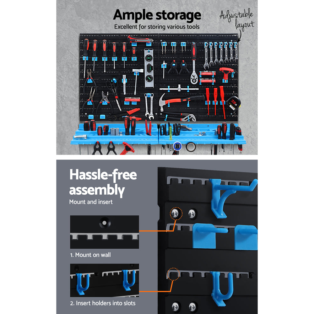 Are your tools always cluttering up your garage due to inadequate storage space? Well, now you can get more organised with our Giantz Tool Storage Rack. The rack is the perfect space-saving solution for storing your tools and accessories in your garage or storage room and makes it easier for you to find the rights tools when you need them. The 4 ultra-durable peg boards are simple to mount on the wall and feature an upgraded mounting slot design for extra stability in securing your tools. Then just insert the 4 shelves and 100 tool holders into the peg board slots for instant storage. The best part is that the tool holders are removable, so that you can easily change their layout on the peg board to accommodate future additions to your ever-growing tool collection. Make workbench storage easier, choose Giantz for all your workshop needs!