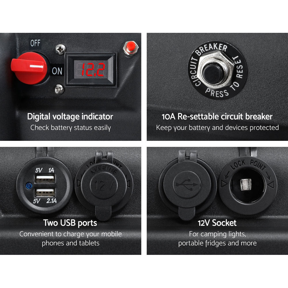 Have 12V battery will travel. With the Giantz Battery Box, there is no need to limit yourself to one location or one purpose for your deep cycle battery. The box can easily fit any deep cycle battery that measures L 35cm x W 20cm x H 22.5cm and turn it into a great power station. You can power up a host of devices including camping lights and portable fridges with its cigarette lighter socket as well as mobile phones and tablets with the two USB ports. The box itself can be charged using solar panels or any power source with its quick-connect Anderson plugs. Better still, the box comes pre-wired, so all you need to do is to connect to the deep cycle battery terminals and it is good to go. The box is strong and sturdy with a built-in voltage indicator and circuit breaker for safe and hassle-free use.