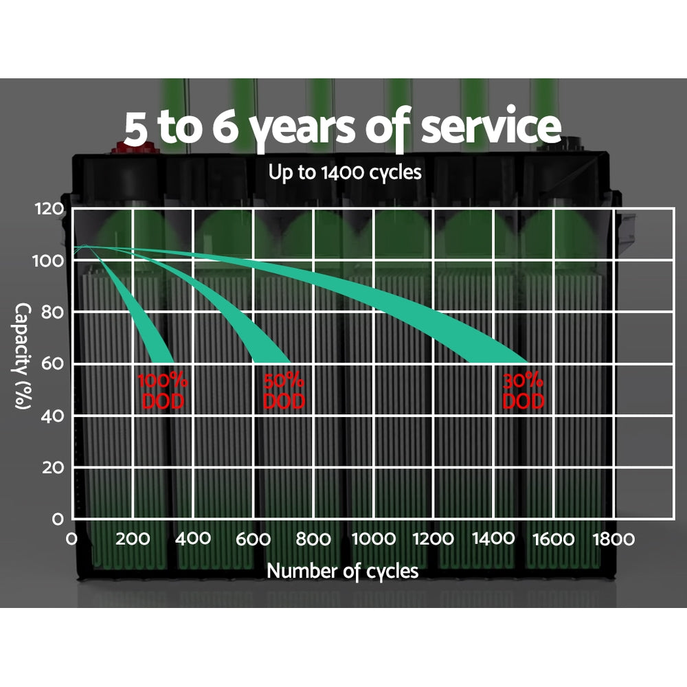 The portable GIANTZ Deep Cycle Battery provides off-the-grid power supply for 4WD vehicles, caravans, campers, trailers, motor homes, saltwater/marine applications, and all 12V appliances including portable fridges and washers. The slim design makes this deep cycle battery compact and space-saving. Plus, the exceptional 135Ah 12V battery features an incredible cycle life of up to 1400 cycles, making it one of the most enduring in its class. What you get is a longer, consistent and more drawn out charge all the time. And with its advanced AGM technology, the battery enables better electrolyte absorption, cyclic stability, better low temperature reliability and frequent charging without affecting performance. The bolt down terminals also allows for more reliable experience, and not least, the high oxygen-recombination efficiency results in superior deep discharge recovery. The maintenance-free deep cycle battery is completely sealed, spill-proof and does not leak gas for added safety and durable use.
