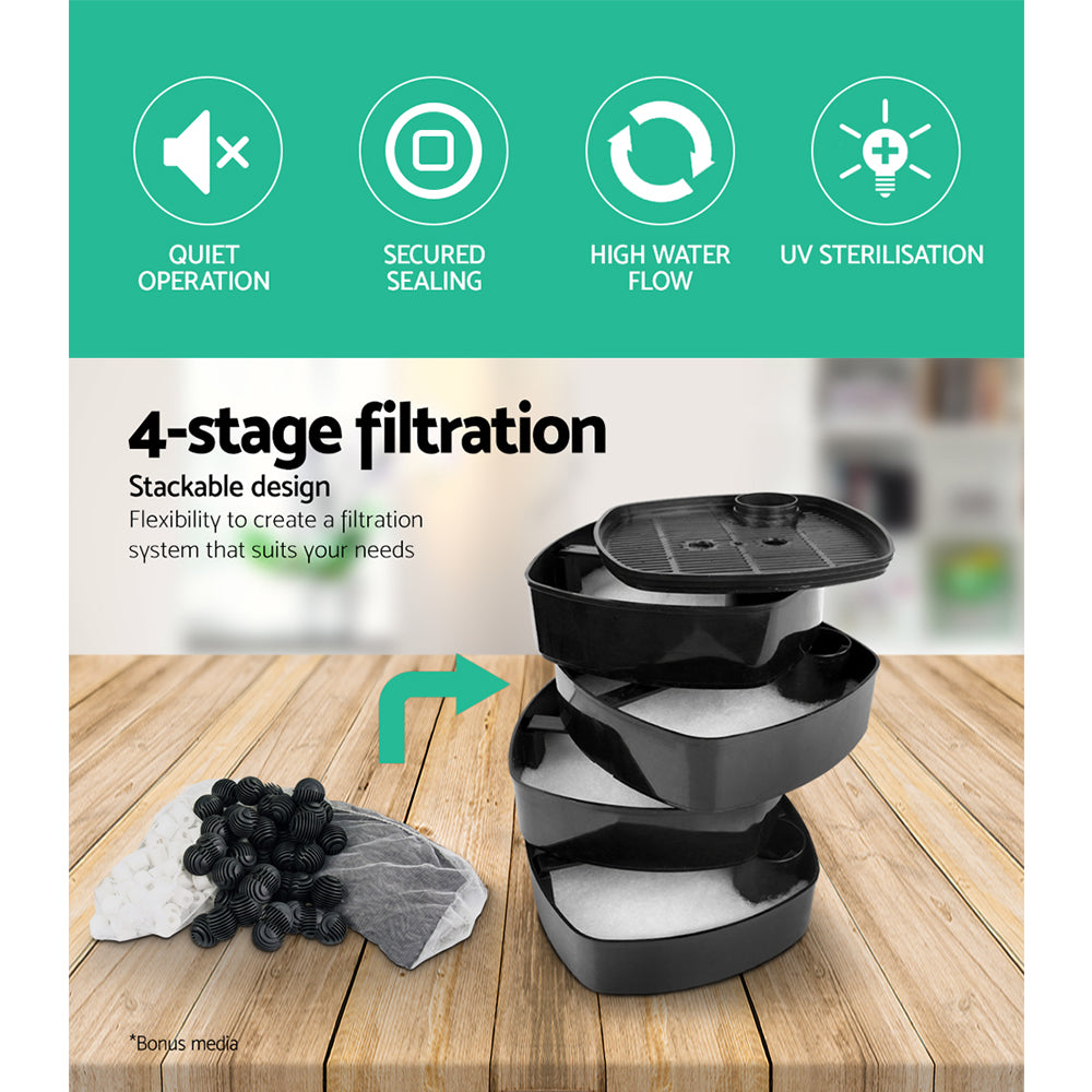 Suitable for both freshwater and saltwater aquariums sized up to 500 litres, this type of external filter avoids the need for an unsightly filter inside the tank. It runs on 55W power for energy-efficient operation and has a flow rate of up to 2400L/h. The 4-level stackable filter design means you can create a filtration system to suit your needs, by using all or some tiers and filling with your preferred media (bonus media included). Designed with a tight cap lock with no need to worry about leaks and coming with a full set of accessories, it is very easy to set up without any specialised tools required.