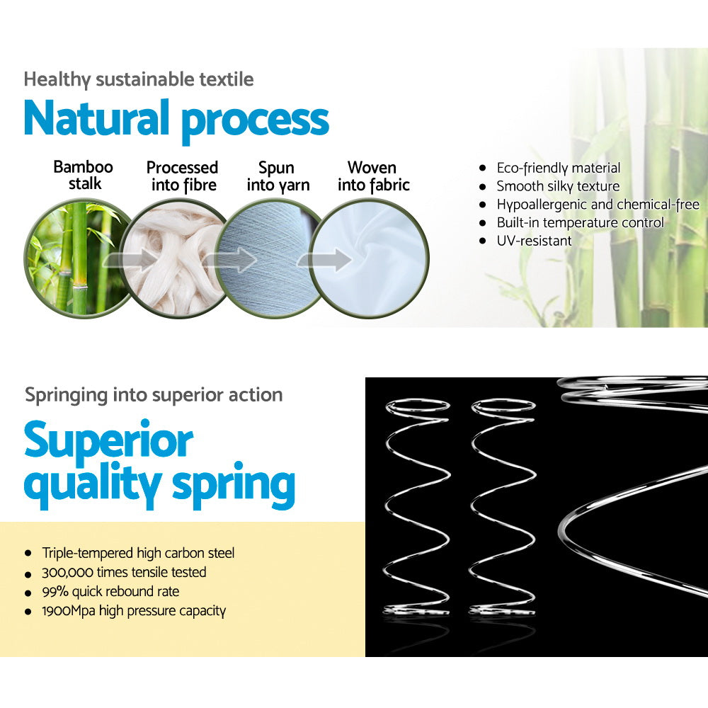 Now, with an exclusive 500gsm bamboo charcoal knitted fabric cover, the Giselle Bedding Alanya Series 34cm Euro Top Mattress is certainly above and beyond the ultimate in sleep health. This means that Mattress has even more health benefits for you including better blood circulation and reduced stress over a full night's sleep. The lavish construction also addresses all the elements that make for quality sleep– plush Euro Top padding, high-density foam and an innovative independent coil system for unrivalled zonal support. Also, with its 34cm thickness, our Euro Top Mattress guarantees absolute comfort with medium-firm support that many Australians love and desire. Not least, the Euro Top Mattress comes with side handles for effortless positioning. So awake rejuvenated every day and make it a really good morning with the Giselle Bedding Alanya Series 34cm Euro Top Mattress. Get yours today.