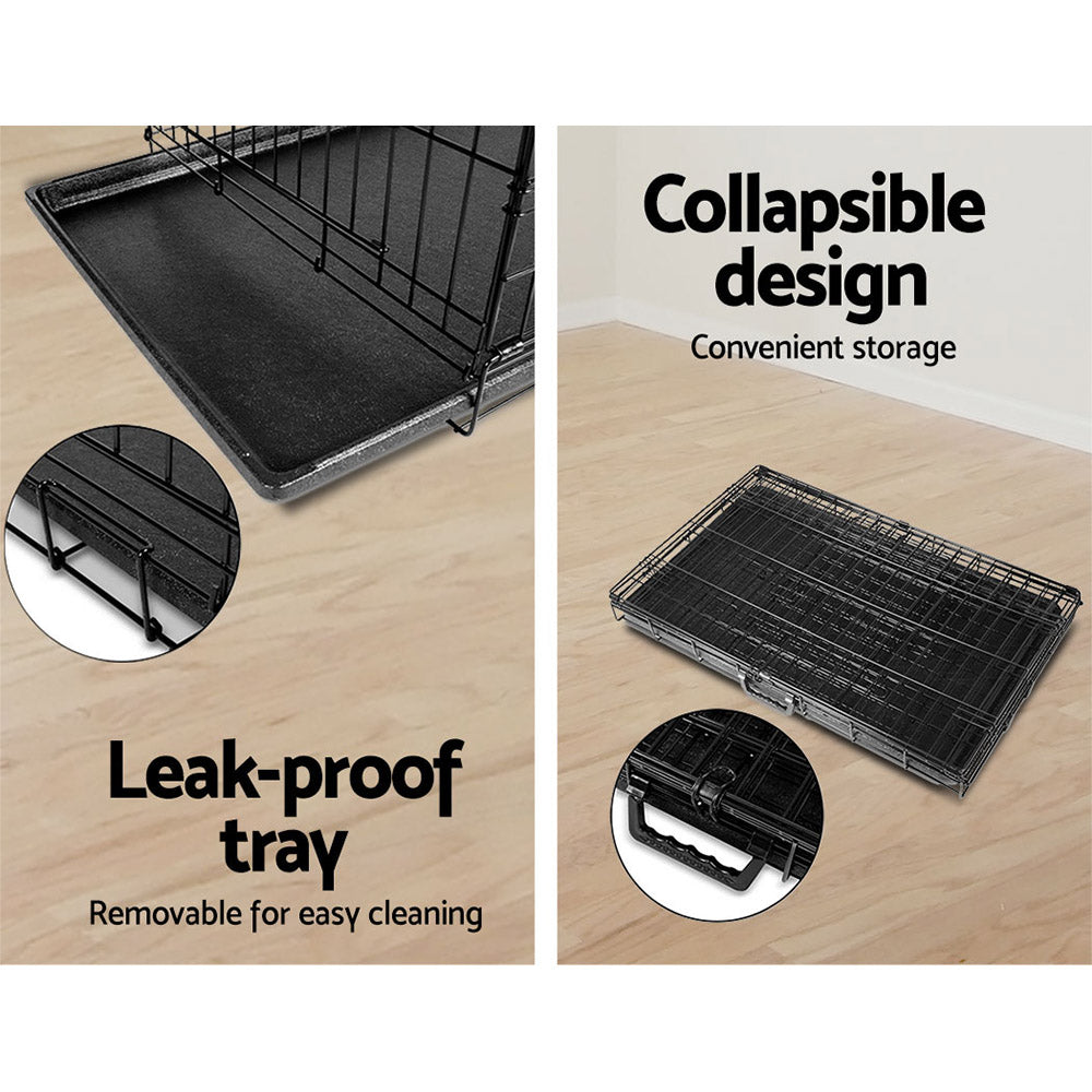 Featuring a foldable design with triple access doors, this dog cage offers maximum convenience and is extremely safe for containing your pets. It's metal constructed with a powder coated finish enhancing durability and is also rust resistant. Easy to setup, store, transport and clean, an absolute hassle free purchase! Great for securely keeping your pets contained, a must have for every pet owner.