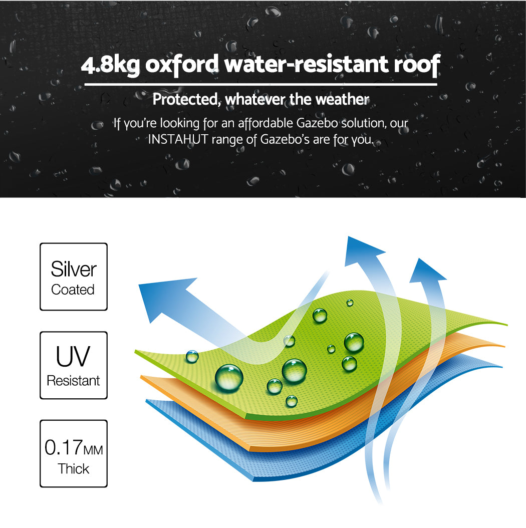 Featuring high density, long lasting silver-coated oxford fabric with effective UV and water repellent treatments, this INSTAHUT 4.5X3 Pop Up Gazebo provides a lovely ground and canopy coverage of 450 x 300cm. It is perfect for all your upcoming outdoor activities, as a sunshade station as well as a shelter for unexpected rains.