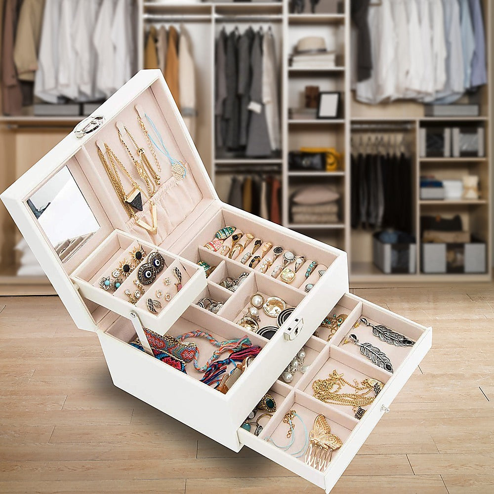 A small pop-up compartment with removable earring stands gives you flexibility--use it for your earrings or remove the stands to store other small pieces. On the second level, six compartments and soft, pillowy ring rolls provides room for even a huge jewellery collection. Underneath, a drawer with removable dividers gives you a wide range of storage options.