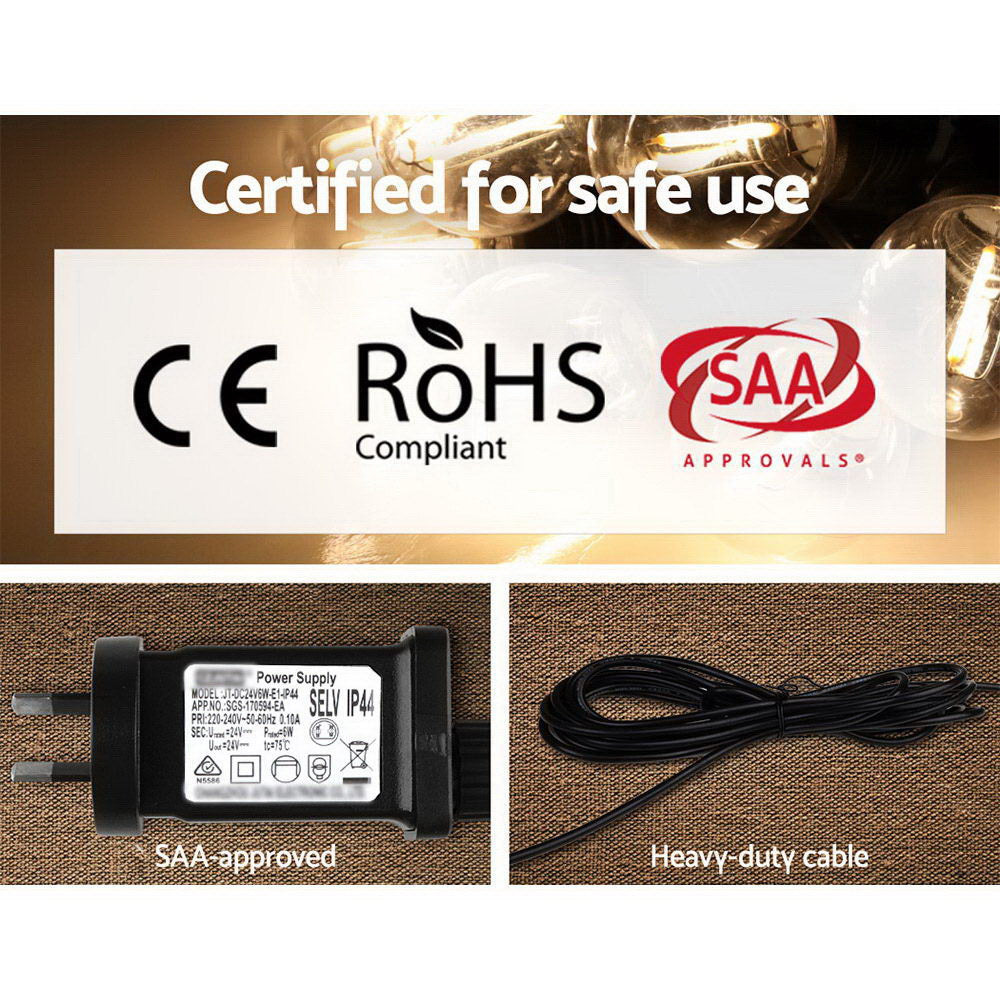 Our Jingle Jollys Festoon String Lights are great not only for wedding and birthday parties or special events, but also for creating a warm, inviting ambience with its bright and mellow glow. Suitable for both indoor and outdoor use, its IP44 rating means that it can be used in the rain and all weather conditions. Each bulb draws a very low voltage and is placed 90cm equally apart from each other throughout its 23m length for an even distribution of illumination and brightness. Not least, the each bulb has a 20,000 hours lifespan so that you can get to use the string lights for quite a while.
