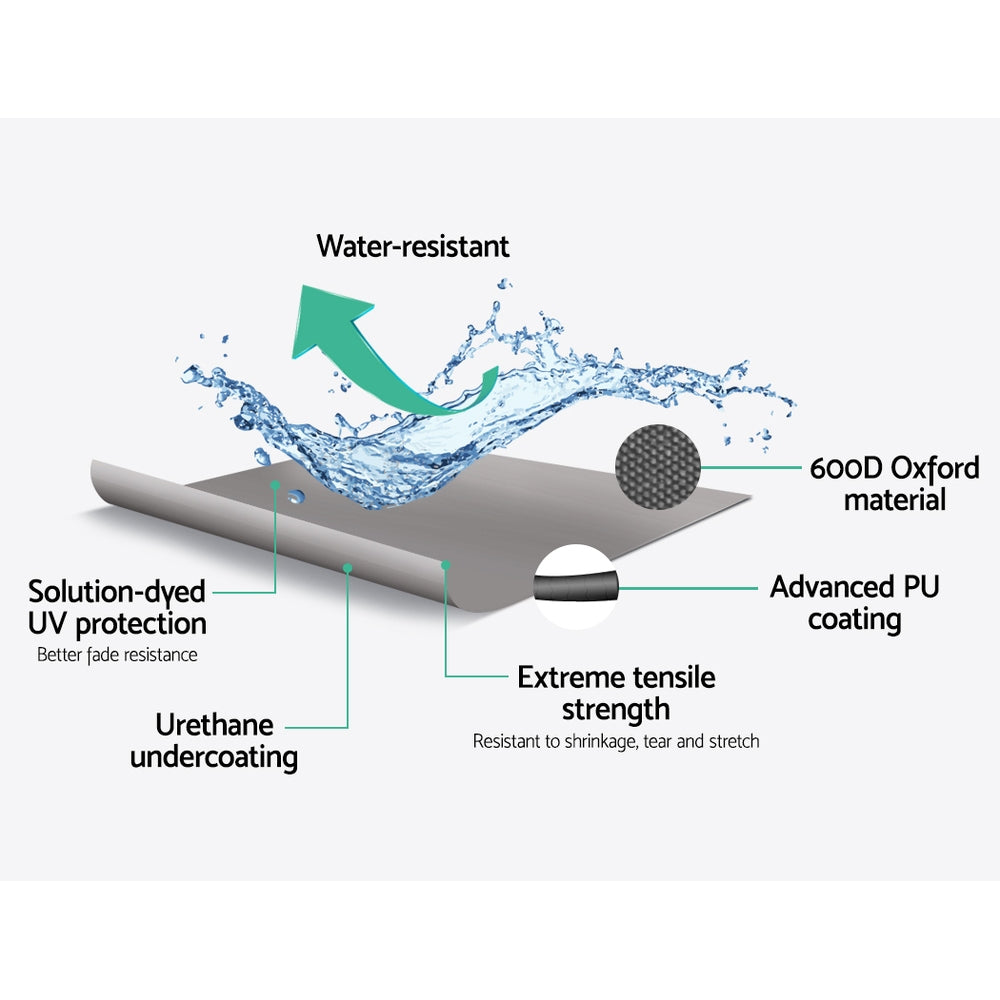 The Cover is made of 600D polyester with PU coating for effective UV and mildew resistance. It also features elastic hems for easy fitting and double-stitched seams for added strength.