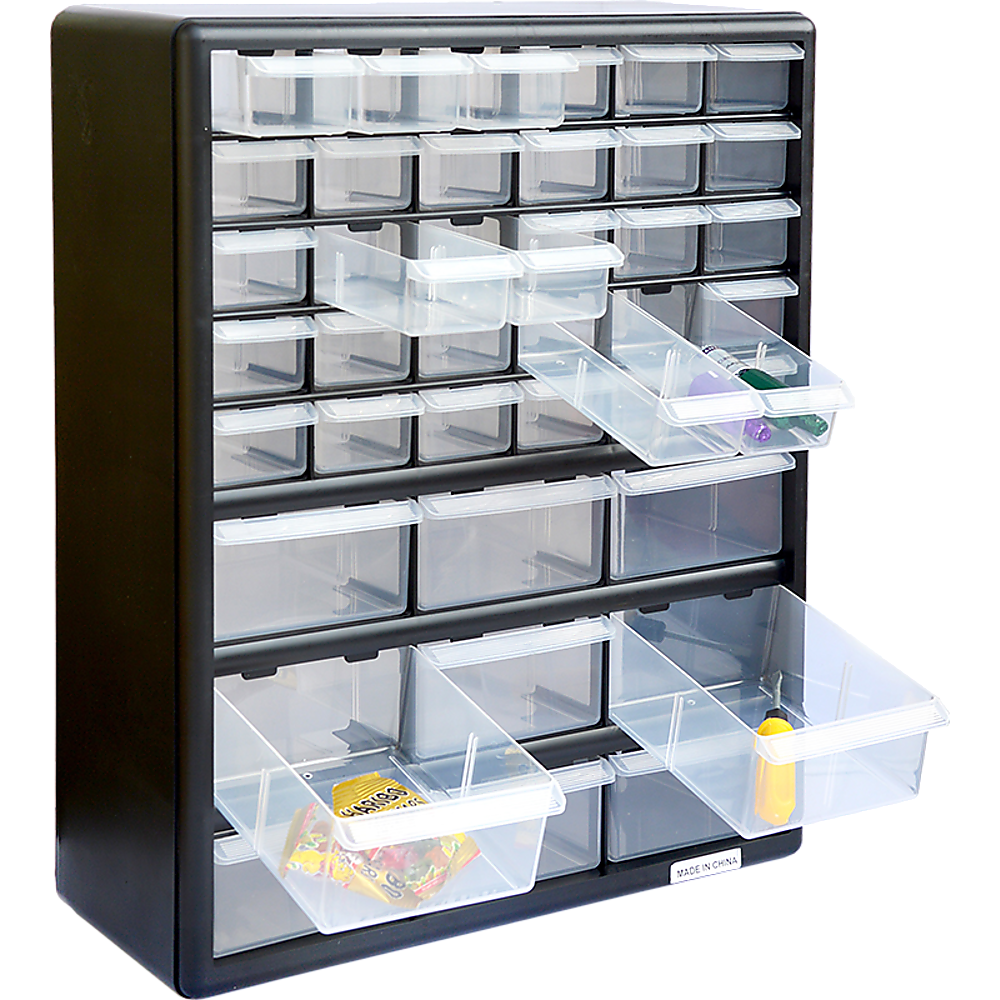 This is the Organiser you need to help you create a stress-free, tidy, and neat work place or hobby area. With 39 Plastic Tool Boxes contained in this one organiser, you'll find a place for every small item in your workspace. It can even be attached to the wall or another surface. Use labels to personalise the clear drawers on this black cabinet. Declutter any space simply and effectively with this Storage Cabinet Cupboard.