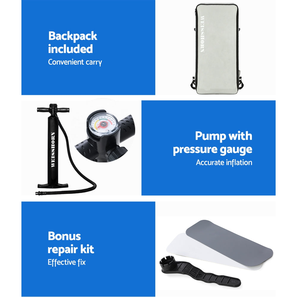 Our Weisshorn Stand-up Paddle Board is designed to suit the beginner paddler as well as a seasoned and easily fits both paddler and passenger for hours of maximum enjoyment. Better still, it is made from durable drop-stitch core material and easy to inflate and deflate, with similar build qualities that you will find with its pricier fibreglass counterparts. It maintains rigidity and toughness with a thickness of 15cm and has a weight capacity of up to 185kg. The supplied 1.7m adjustable aluminium paddle is highly versatile in both paddling and steering while the three fins underneath the board ensure steady gliding, easy manoeuvrability and smooth turning. In fact, one of the fins is removable to give better directional stability. Getting your aquatic escapades started with the paddle board is a simple task of inflating it with the included pump and you are good to row. And because it can be packed away into its handy travel bag, you can take the paddle board just about anywhere you want to go for your water adventures. Also included is a repair kit and a quality adjustable kayak seat that can turn your paddle board into a kayak to enhance your comfort. The kayak seat also comes with a storage pocket where you can conveniently place your personal belongings.